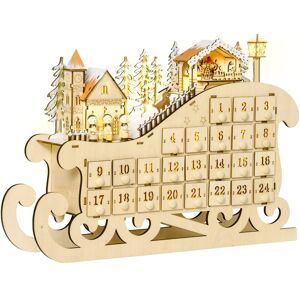 Homcom Calendario dell'Avvento in Legno a Forma di Slitta con 24 Cassetti da Riempire, Decorazioni e Luci a LED, 45x10x31cm